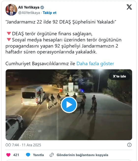 İçişleri Bakanı Yerlikaya, sosyal medya hesabından yaptığı paylaşımda, Türkiye’nin her bölgesinde huzuru ve istikrarı sağlamak için yılın 365 günü, gece gündüz yürütülen operasyonlara devam edildiğini belirterek, şu ifadelere yer verdi; "DEAŞ terör örgütüne finans sağlayan, sosyal medya hesapları üzerinden terör örgütünün propagandasını yapan 92 şüpheliyi Jandarmamızın 2 haftadır süren operasyonlarında yakaladık. Cumhuriyet Başsavcılıklarımız ile Jandarma Genel Komutanlığı TEM Daire Başkanlığımız koordinesinde; İl Jandarma Komutanlıklarınca, Adana, Aksaray, Antalya, Bursa, Çanakkale, Çankırı, Diyarbakır, Gaziantep, Hatay, İstanbul, İzmir, Kayseri, Kırıkkale, Kırşehir, Kocaeli, Konya, Malatya, Mersin, Osmaniye, Siirt, Tekirdağ ve Yozgat olmak üzere toplam 22 ilde son 2 haftada operasyonlar gerçekleştirildi." /İHA
