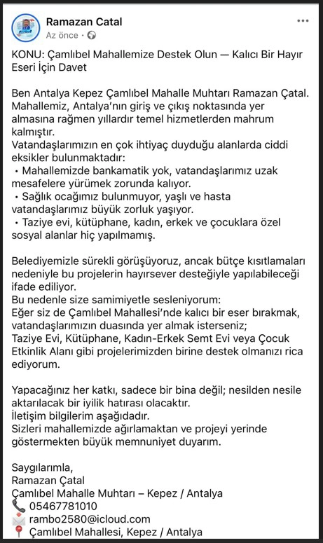 Eğer siz de Çamlıbel Mahallesi’nde kalıcı bir eser bırakmak, vatandaşlarımızın duasında yer almak isterseniz; Taziye Evi, Kütüphane, Kadın-Erkek Semt Evi veya Çocuk Etkinlik Alanı gibi projelerimizden birine destek olmanızı rica ediyorum. Yapacağınız her katkı, sadece bir bina değil; nesilden nesile aktarılacak bir iyilik hatırası olacaktır.” /ANTALYAGÜNDEM