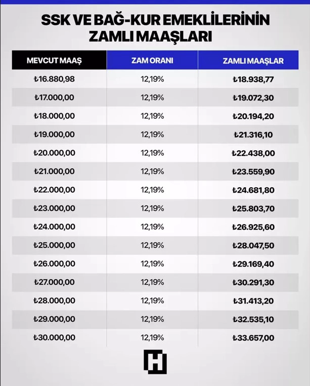 SSK ve Bağ-Kur emeklileri için maaş artış oranı 6 aylık enflasyon verilerine göre belirlendi. Temmuz ayında yüzde 2,06, Ağustos’ta yüzde 2,04, Eylül’de yüzde 3,23, Ekim’de yüzde 2,55, Kasım’da yüzde 0,87 ve Aralık’ta yüzde 0,89 olarak gerçekleşen artışlar sonucunda artışlar sonucunda SSK ve Bağ-Kur emeklileri toplamda yüzde 12,19 oranında zam alacak.