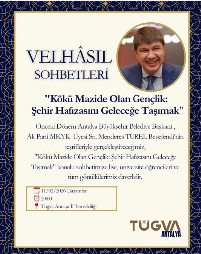 TÜGVA Antalya İl Temsilciliği tarafından düzenlenen Velhasıl Sohbetleri’nin bu haftaki konuğu, önceki dönem Antalya Büyükşehir Belediye Başkanı ve AK Parti MKYK Üyesi Menderes Türel olacak.