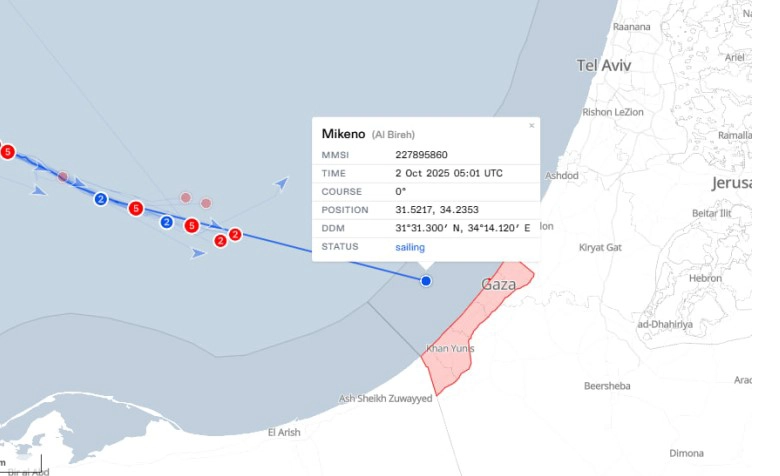 Gazze’ye en önde ilerleyen Mikeno’nun İspanya’dan hareket eden teknelerden biri olduğu ve gemide Türkiye’den bir aktivist – Muhammed Huzeyfe Küçükalptekin bulunduğu açıklandı. Geminin Gazze’ye uzaklığı ise yaklaşık 21 kilometre (11 deniz mili) olarak ölçülüyor.
