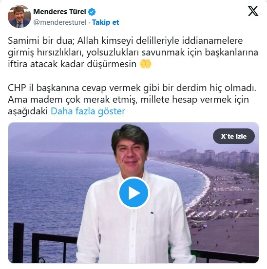 Antalya Büyükşehir Belediyesi eski Başkanı ve AKP MKYK Üyesi Menderes Türel, dün CHP Antalya İl Başkanı Nail Kamacı’nın yapmış olduğu Konyaaltı Sahil açıklamasına tepki gösterdi. Türel, 4 Ağustos 2020 tarihinde yayınlamış olduğu videoyu sosyal medya üzerinden tekrar paylaşarak Konyaaltı Sahili ile alakalı iddialara cevap verdi.