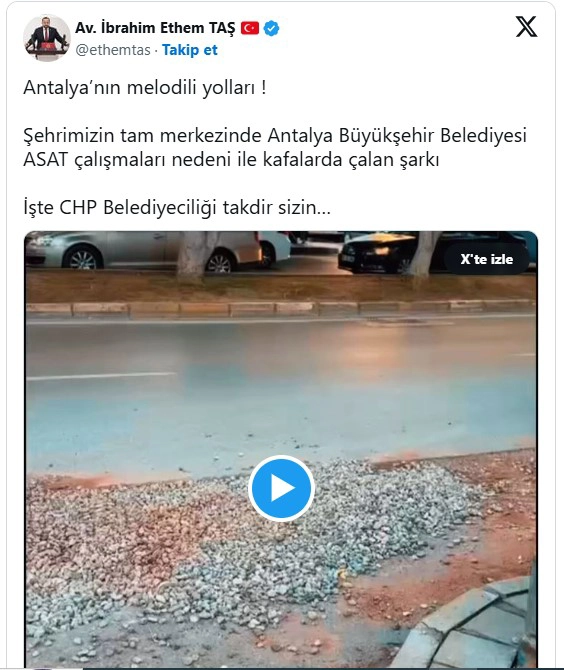 AK Parti Antalya Milletvekili İbrahim Ethem Taş, sosyal medya hesabından paylaştığı video ile Antalya Büyükşehir Belediyesi'ne bağlı ASAT'ın altyapı çalışmalarına tepki gösterdi. Taş, paylaşımında, "Antalya'nın melodili yollar!" ifadelerini kullanarak, şehir merkezinde yapılan çalışmalar nedeniyle sürücülerin ve vatandaşların mağdur olduğunu savundu.
