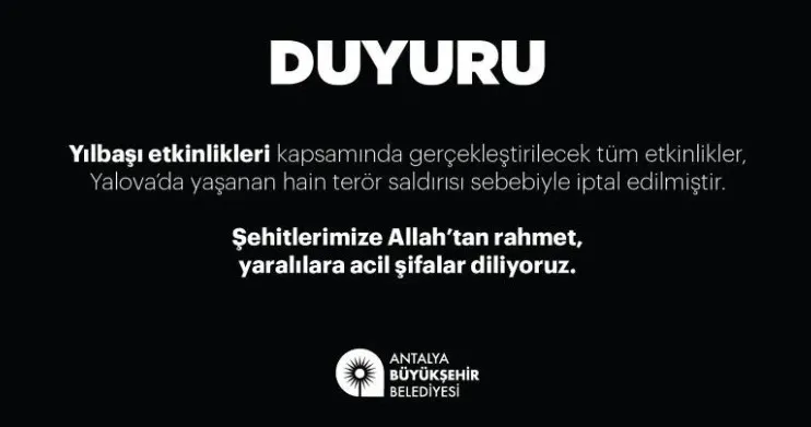 Yalova’da DEAŞ’a yönelik operasyonda 3 polisin şehit olması, 8’i polis biri güvenlik görevlisi olmak üzere 9 kişinin yaralanmasının ardından Antalya Büyükşehir Belediyesi, yılbaşı kapsamında planlanan tüm etkinlikleri iptal ettiğini duyurdu. Antalya Büyükşehir Belediyesi tarafından yapılan yazılı açıklamada, Yalova’da yaşanan terör saldırısı nedeniyle yılbaşı etkinliklerinin iptal edildiği belirtilerek, “Şehitlerimize Allah’tan rahmet, yaralılarımıza acil şifalar diliyoruz” ifadelerine yer verdi.